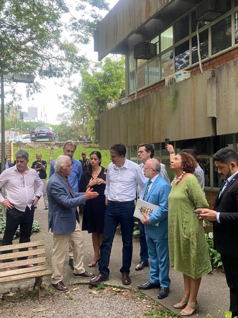 O Ministro da Educação, Camilo Santana, cumpriu agenda na UFSC, em Florianópolis, na segunda-feira, dia 08 de dezembro, para acompanhar as obras do Centro de Educação (CED), que estão sendo financiadas com recursos do PAC das universidades.Na oportunidade, atendendo ao convite da direção do Centro de Ciências Jurídicas (CCJ), o ministro também visitou o Jardim Cancellier, onde foi recebido pela Profa. Carolina Medeiros Bahia, diretora do CCJ, e pelo Prof. Samuel da Silva Mattos, autor do projeto de extensão de resgate da Memória do Prof. Luiz Carlos Cancellier de Olivo, rendendo uma justa homenagem ao saudoso professor, que que marcou sua trajetória na UFSC a partir do Centro de Ciências Jurídicas, do qual também foi Diretor.