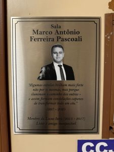 A cerimônia foi finalizada com o descerramento da placa que nomeia a sala 107 do CCJ/UFSC – sede da Empresa Júnior Locus Iuris Consultoria Jurídica – como “Sala Marco Antônio Ferreira Pascoali”, eternizando, merecidamente, a vida e o legado de Marco dentro do Centro de Ciências Jurídicas da Universidade Federal de Santa Catarina.